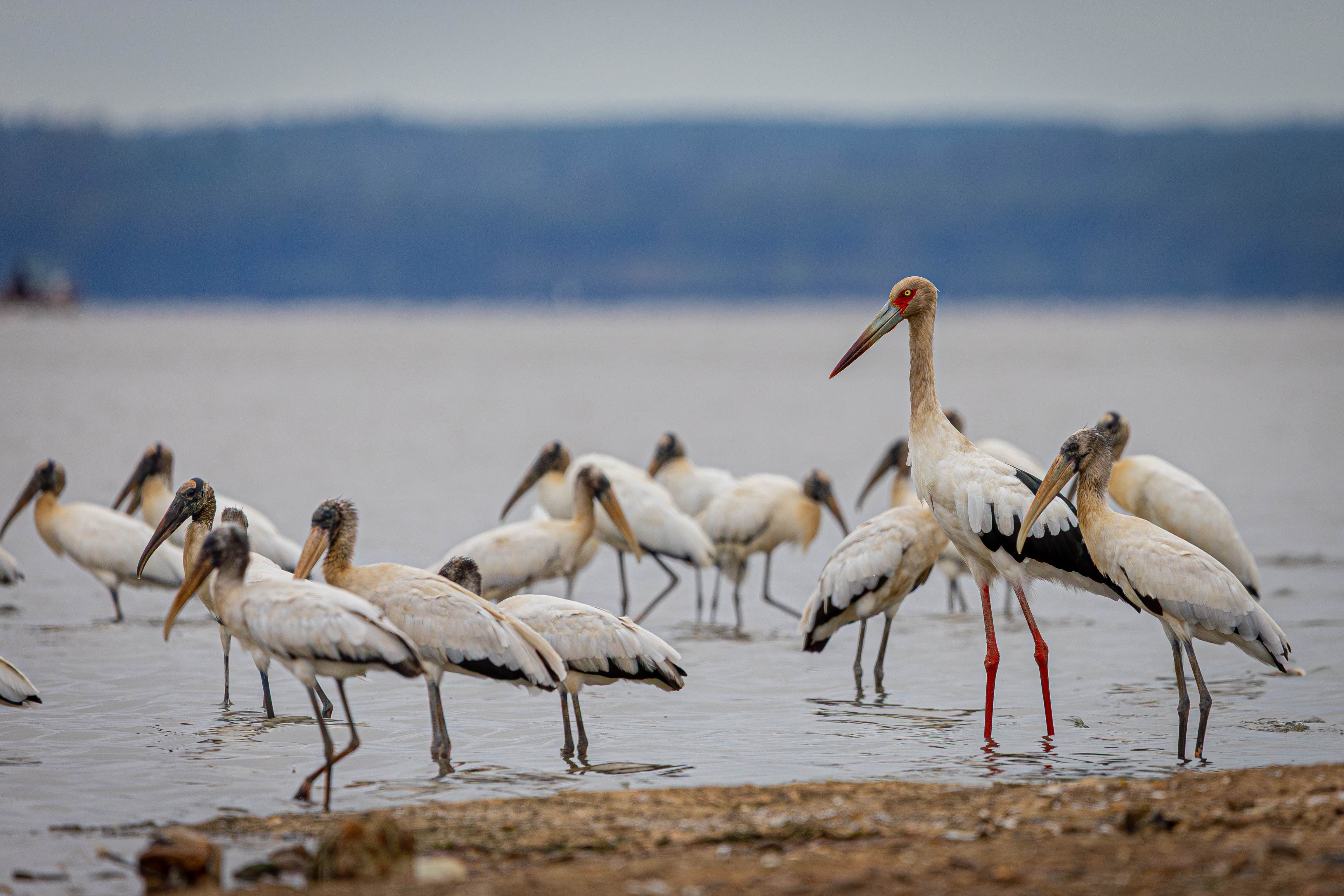 Es un ave de gran tamaño; alcanza los 130 cm de largo, desde el pico hasta la punta de la cola, y 85 cm de altura de pie, con poco dimorfismo sexual. Es de color blanco, con la cabeza, el cuello y el pecho con reflejos grises. Las plumas primarias y secundarias del ala, así como las supracaudales, son de color negro y tornasoladas. La cola es también negra. Parte de la cara es desnuda, de color rojo. El pico es largo, cónico y robusto, de color verde azulado en la parte posterior y rojo violáceo en la parte anterior. Las patas son rojas. En la temporada de celo, los colores de las partes desnudas se avivan.