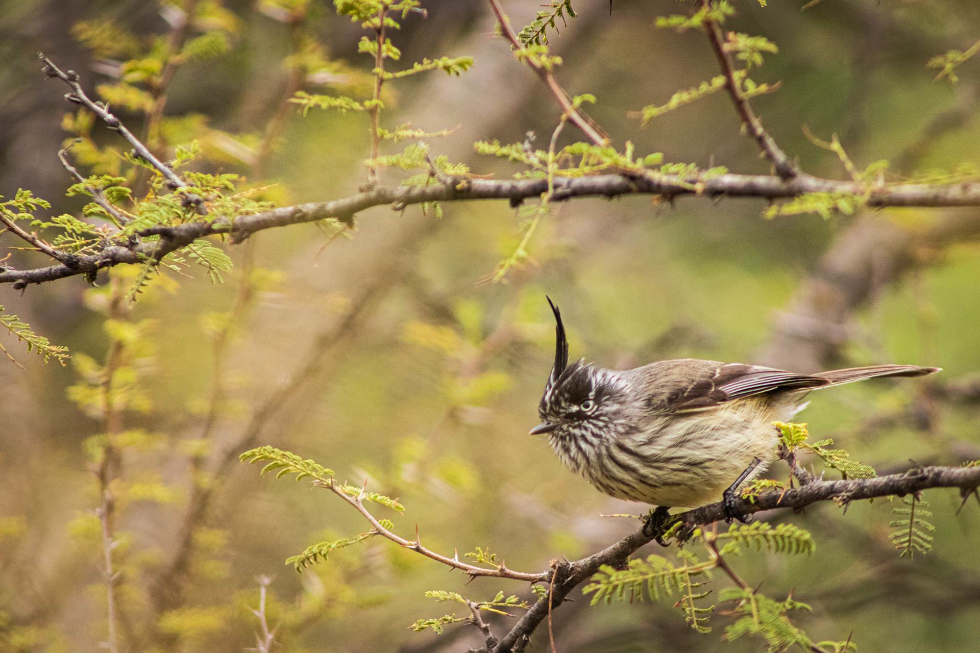 The Tufted Tit Tyrant (Anairetes parulus), commonly known as chick, common chick, black-billed chick or bull. Its beak is black, thin and short. The white iris. The black head with white striations on the forehead, sides of the face and earphones. It has an erect tuft of black feathers on the crown. The wings are blackish, with white edges on the outer secondaries, and the lower parts of the body are pale yellow with fine black longitudinal striations, especially on the throat and chest, and are about 11 cm long. With fast and agile movements, it can be observed among the trees or bushes in search of insects. It is found solitary, in pairs or in small flocks. Nests between October and December. Its nest is of the cup type, made of lichens, branches and strands of grass, it is carefully worked and lined with feathers, located in trees 1.5 or 2 m from the ground. As the chicken grows, the cavity enlarges.