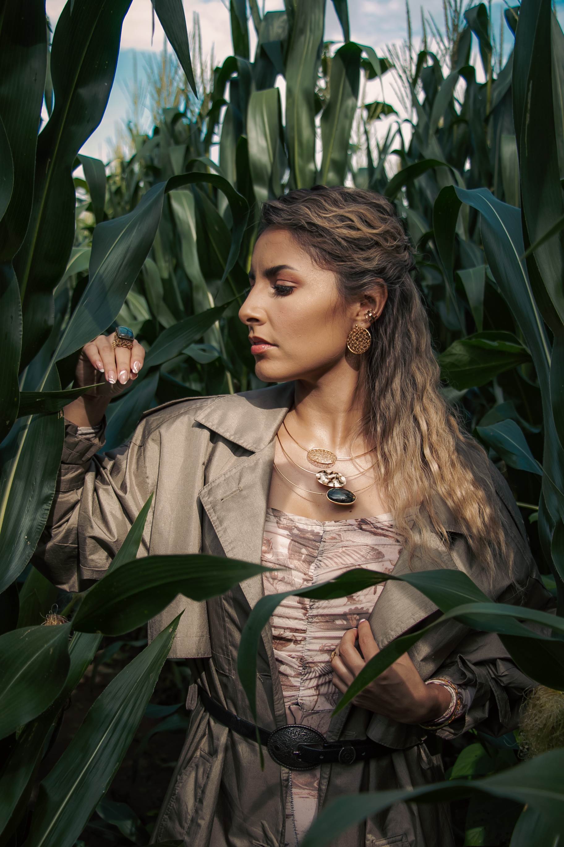 Sesión realizada en campo de cultivo para reconocida diseñadora de joyería artesanal , con día lluvioso.