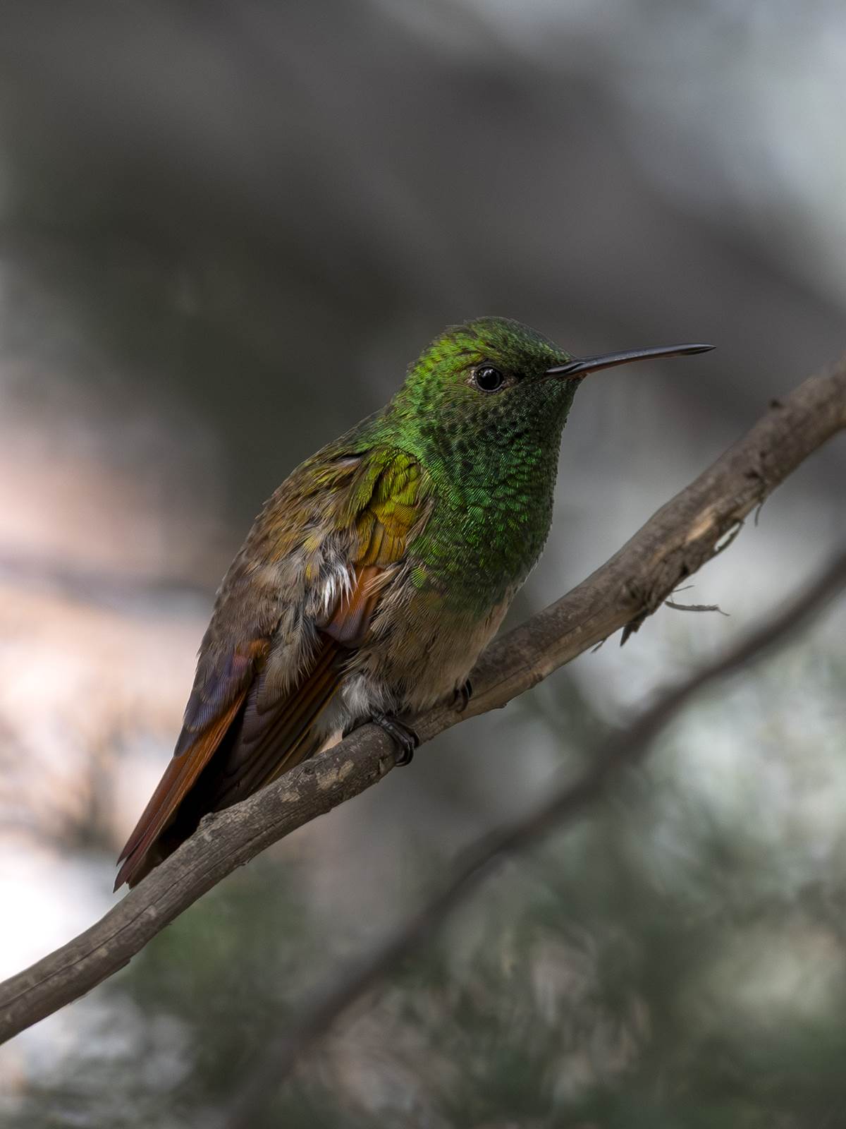 Colibrí berilo perchado sobre una rama. Se observan los coloridos tonos que tienen sus bellas plumas.
