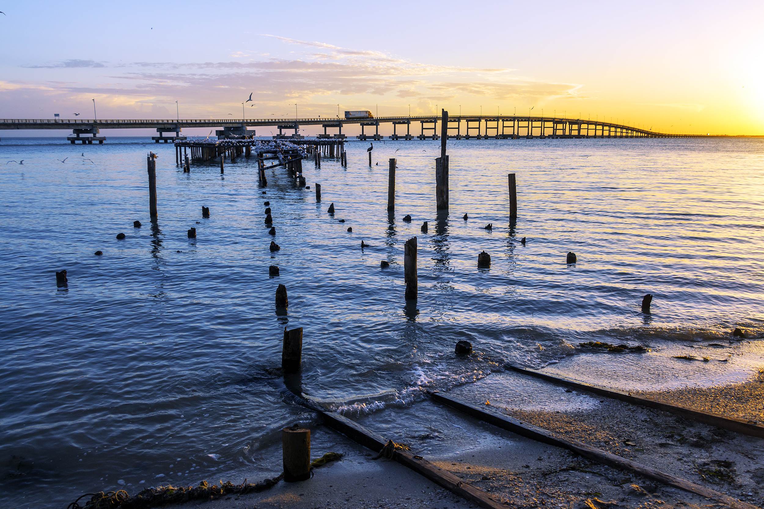 Las ruinas de un viejo muelle y el puente El Zacatal, uno de los dos accesos a la isla de Ciudad del Carmen, en una tarde de invierno en el Golfo de México.